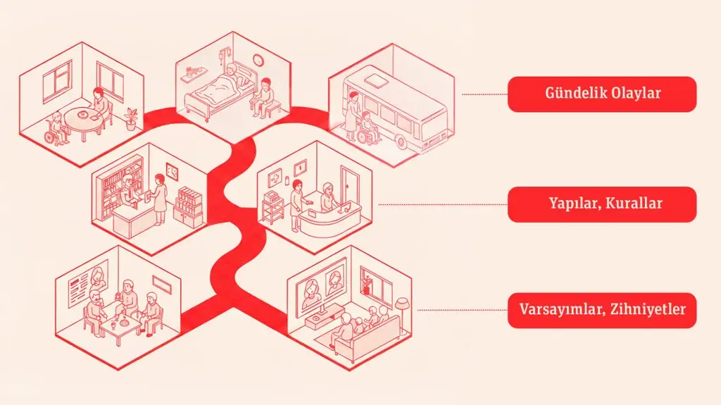 Olayların akışını belirleyen iskelet buradadır. Mevzuatlar, bütçeler ve kurumsal işleyişler, alt katmandaki zihniyetin yasalaşmış halidir. İşyeri politikaları, engelli aylığı ve ulaşım sistemleri gibi kurallar seti gündelik hayatımızın sınırlarını çizer.
