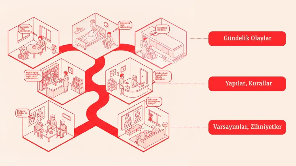 Neyi “doğal” neyi “görev” kabul ettiğimizi belirleyen bu katman, yukarıdaki tüm yasaları ve olayları birer gölge gibi yönlendirir. Televizyondaki “Yıllarca engelli oğluna bakan kahraman anne” haberleri bu katmanı besler. Bakım bir kamusal hak yerine kadının “kutsal ve doğal görevi” olarak görüldüğü sürece, Ayşe Teyze’ye tek başına yüklenen bu sorumluluk bir sistem sorunu değil, bir “sevgi borcu” olarak algılanır. Bu zihinsel model değişmeden, yukarıdaki kuralların değişmesi sadece geçici makyajlar olarak kalacaktır.